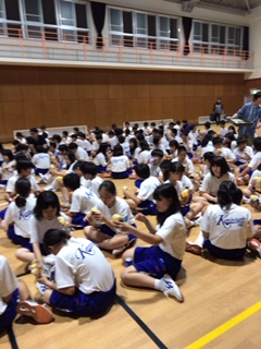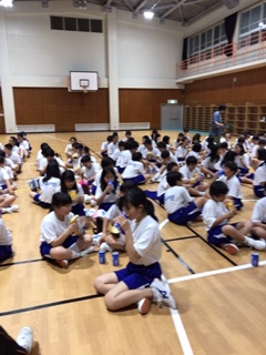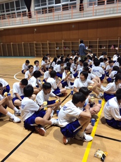 校歌は2組、長縄跳びは3組がそれぞれ優勝しました。写真はレクレ大会が終わって、捕食のパンをいただいているところです。