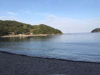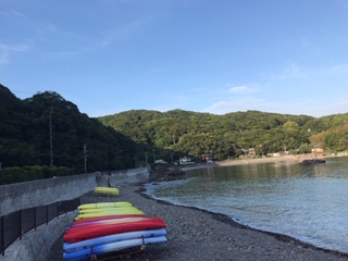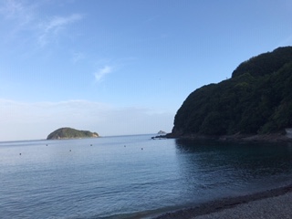 おはようございます。朝日に映える宿舎前の海です。今日の起床は6時半、もうすぐです。