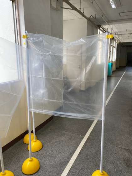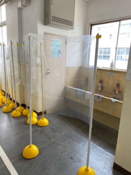 明日から分散登校を行いますが、生徒のみなさんを迎えるにあたり旗立てとゴミ袋を使用して、生徒・教師お互いを守るシート作り完了しました。