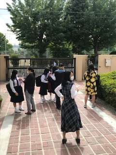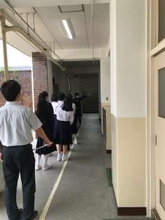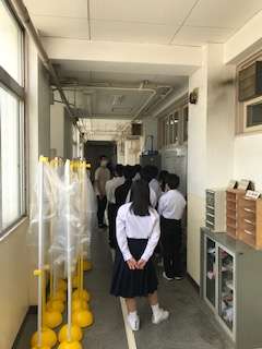 15日は1年生の登校日です。健康チェックのあと宿題を提出し、オリエンテーションを行いました。その後、校舎見学をしました。初めての中学校の校舎見学で、担任の先生から職員室の入り方や図書室・保健室の利用の仕方を教わりました。他にも、特別教室のある場所を歩いて確認しました。