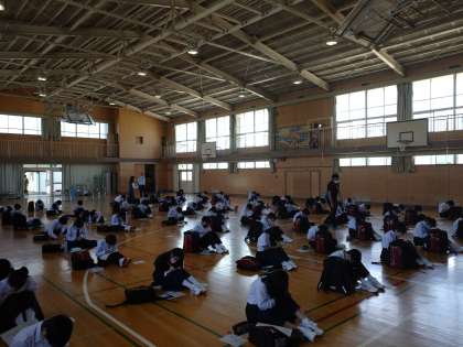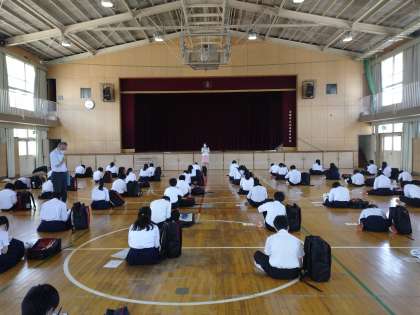 体育館で2クラスずつ、入学式以来のクラス全員集合です。2mの間隔をあけて整列し、中学校生活についてのオリエンテーションを行っています。メモを取る姿も見られます。