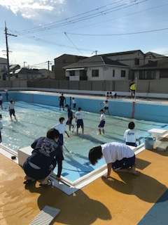 プールの底や壁、排水溝をみんなで一生懸命きれいにして切れました。