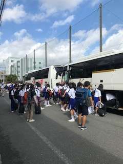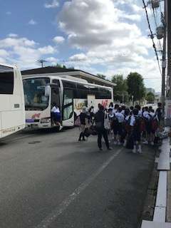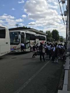 出発式を終えて、バスに乗り込んでいきます。元気に手を振り、予定通り9:00に出発しました。