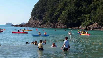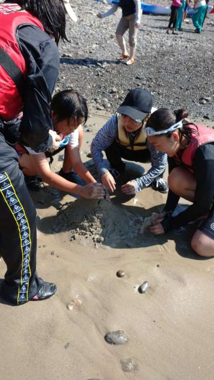 カヌーチーム、カヤックチーム、海水浴チーム、それぞれ楽しそうに活動しています。
