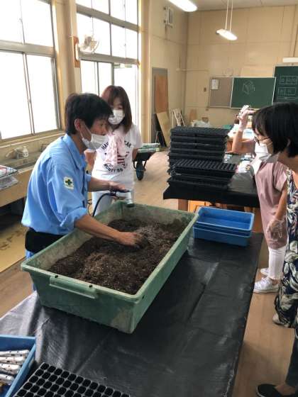 今年度も学校元気アップ事業の一環として、環境整備、花壇づくりをするために種まきを行いました。学校長をはじめ、地域のボランティアの方々に協力していただき実施することができました。また、長居公園事務所より講師を招き種まきの実技指導を行っていただきました。