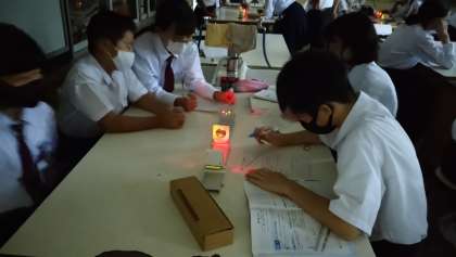 班で協力して、凸レンズを通り抜ける光の特徴を観察しました。