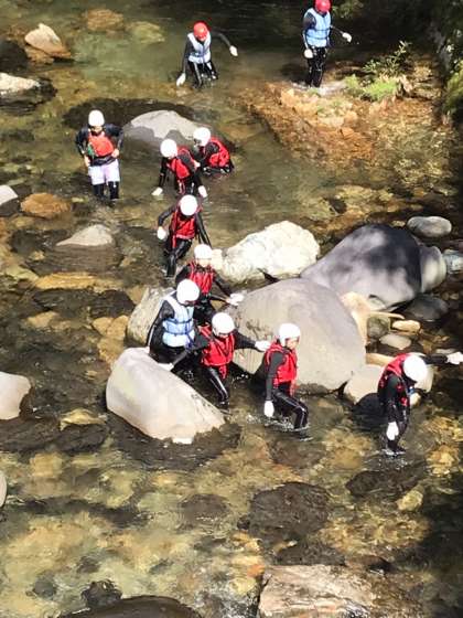 シャワークライミング班は、みんなで協力しながら上流に向かって川を登っています。