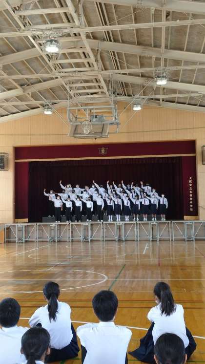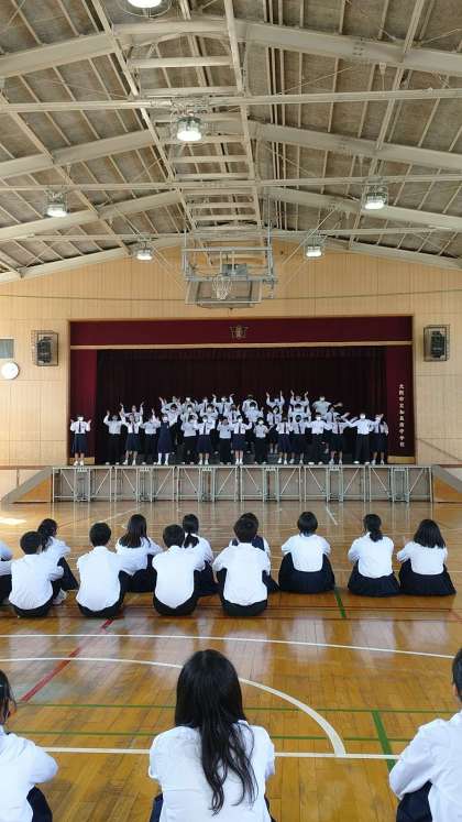 6時間目は体育館で文化発表会の練習をしています。今まで教室で練習してきた手話を、初めて舞台でやってみました。今日の練習をふまえて、各クラスの個性を表現できる手話を披露できるように、実行委員を中心に頑張りましょう。