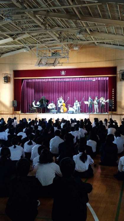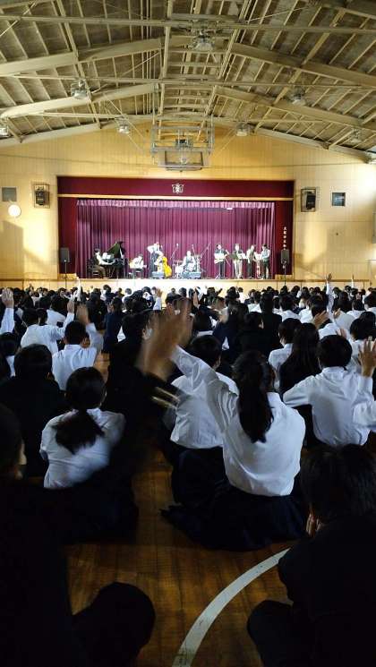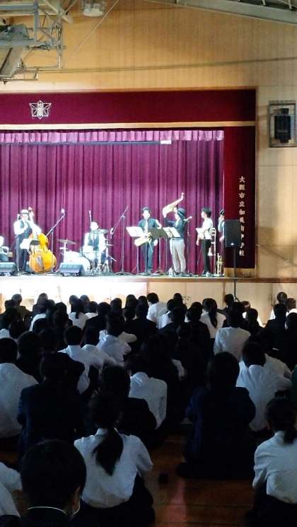 本日は、ジャズの鑑賞をしています。楽器紹介や、ジャズのリズムについてのお話を聞いたり、リズムに合わせて手拍子したりしながら楽しんでいます。