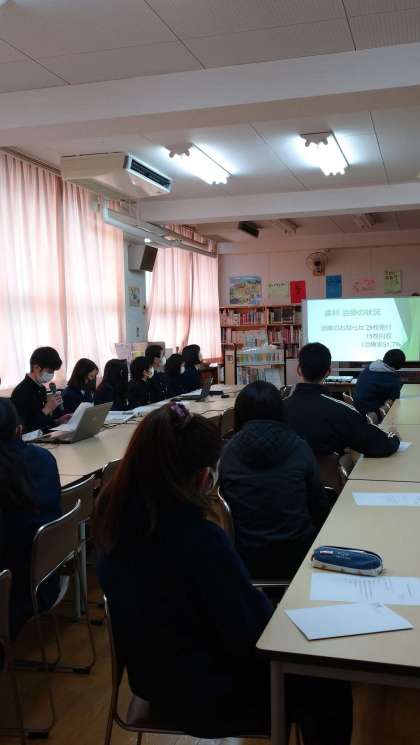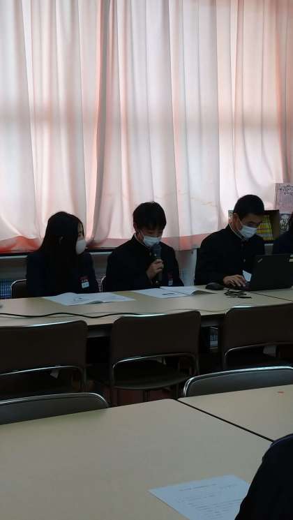 全学年生徒が実施した、手洗い教室の報告をしています。アンケートの感想から、手洗いの正しい方法や重要性を学ぶことができたことがわかりました。ビデオの視聴のパソコン操作も保健委員がおこなっています。