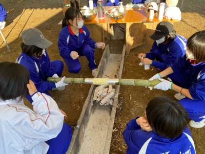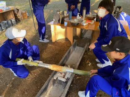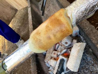 ガスや電気を使わずに薪割をして火をおこし、竹の棒に一層一層丁寧に生地を巻き付けて作成しました。