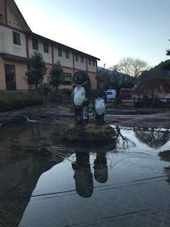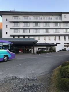 ホテルの全景と健康チェックの様子です。