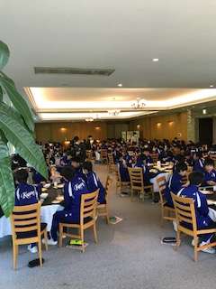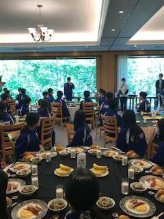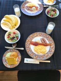 今朝の朝食メニューと食事の様子です。パンのおかわりはフリーです。