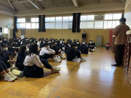 本日の1時限目に第2体育館でキム・ガンジ ソンセンニムからのお話をして頂きました。(写真)