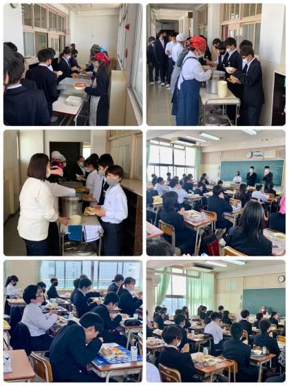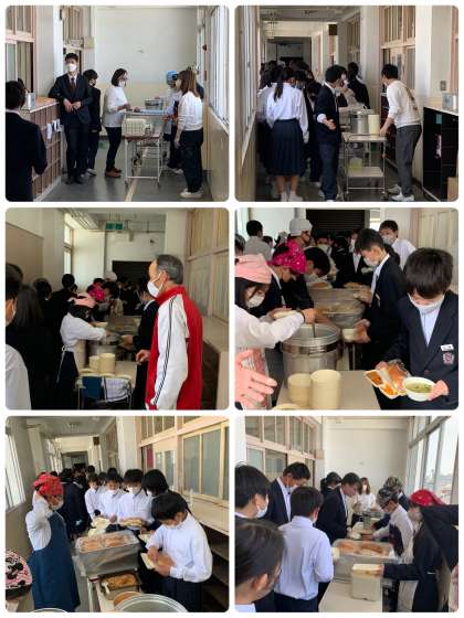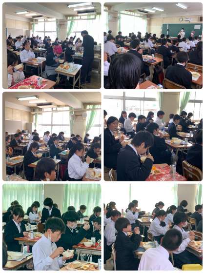 1年生は中学校に入学して、初めての給食を食べました。給食は小中学校ともに同じなので、食べることに関しては同じですが、初めてのクラスでの初めての給食なので、準備から食べるまでの時間は、凄く緊張感があったように感じました。
