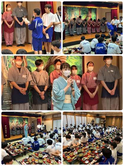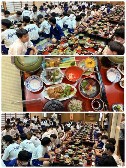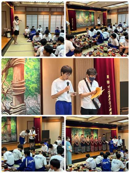 ホテルかずら橋に入館し、各部屋での避難経路確認・荷物整理、破損調査の後、食事会場に集合し、夕食の前に、入館式を行いました。