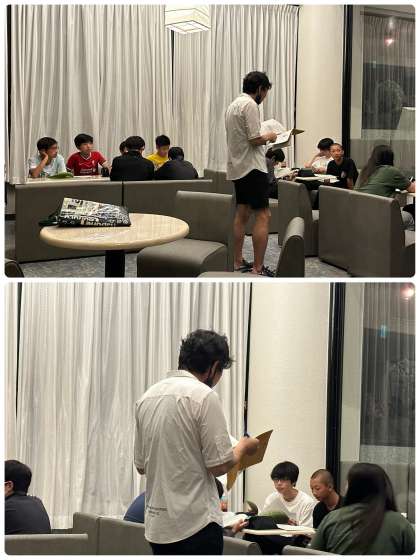 続いて、今日の反省と明日の予定の確認を行いました。明日は午後から雨が予想されるため、雨カッパの用意をしつこく伝えていました。