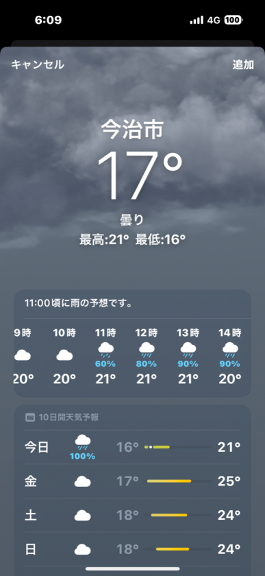 宿泊しているホテルかずら橋のある、徳島県三好市は現在、曇り空です。今日は、愛媛県今治市にて、来島海峡大橋サイクリングを10:30から予定していますが、天気予報では、11:00頃から雨が予想されています。
