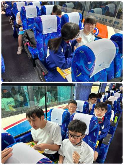 公園内での昼食をバス内に変更し、各クラスごとバス内にて弁当を食べています。