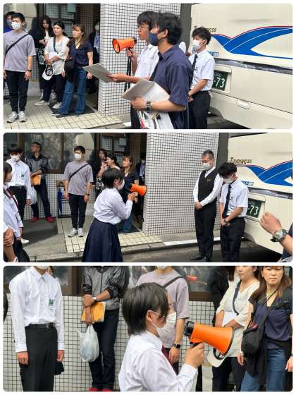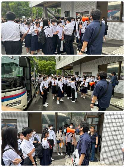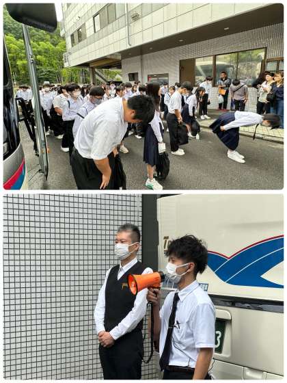 全員が荷物をバスに積み込み、バス駐車場にて退館式を行いました。