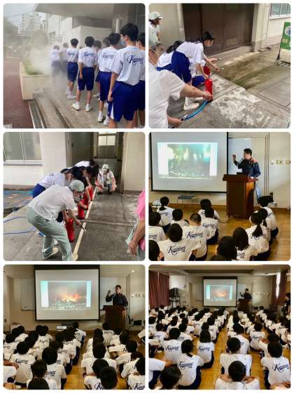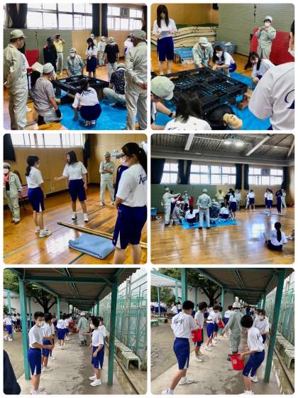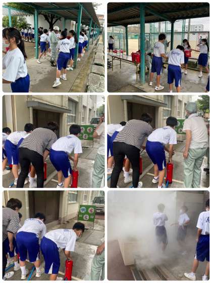 2年生は可搬式ポンプの予定をビニールによる止血法に変更し、それ以外は水消化器、煙体験、バケツリレーを行いました。