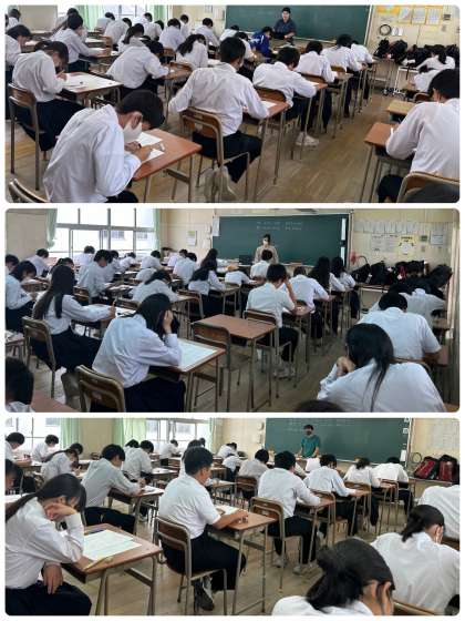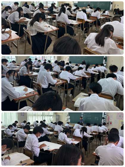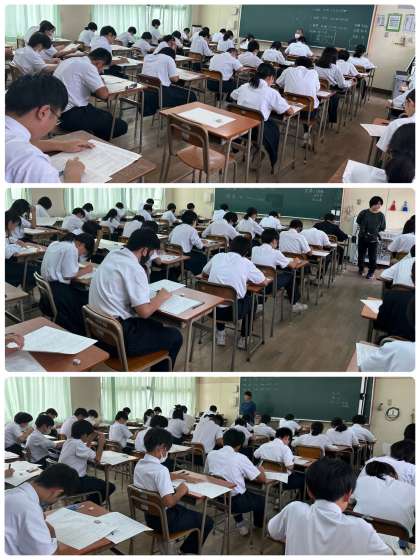 本日10月5日(木)と明日10月6日(金)は、中間テストです。写真は、2限目の1・2年は社会科、3年生は数学科のテストの様子です。全員が真剣にテストに取り組んでいました。