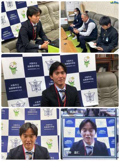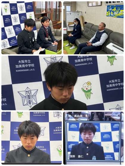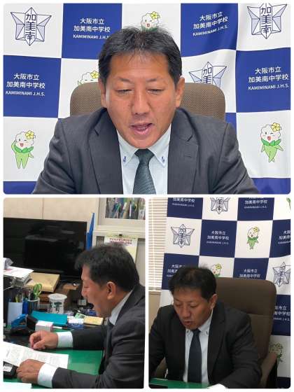 加美南中学校を代表して、自覚と責任を持って話が出来るように、加美南中学校オリジナルのタペストリーを作成しました。今日が初披露になります。学校名、校章、平野区キャラクター「ひらちゃん」(平野区に使用許可申請済)を並べています。
