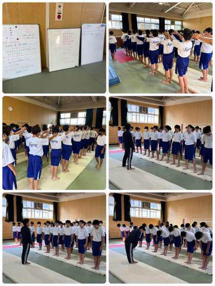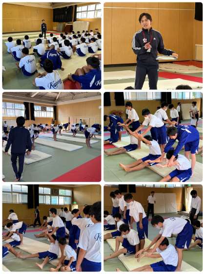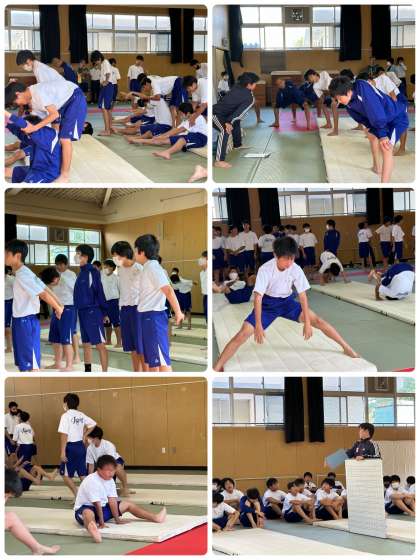 2年3組男子と1年2組男子の合同体育授業です。器械体操(マット運動)の単元で、本時はポイントを押さえ、課題や出来栄えを仲間と共有しようという目標の授業でした。