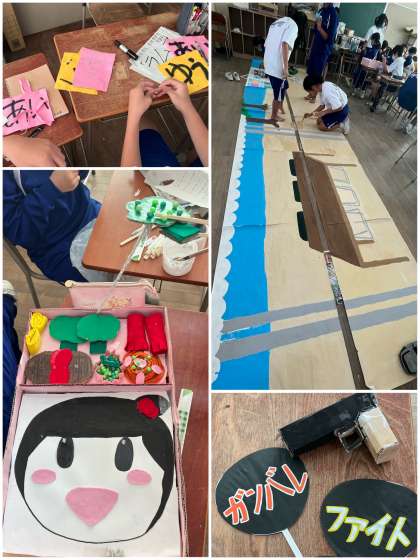 舞台発表の大道具を作っています。キャラ弁(写真左下)のブロッコリーは、傷んでいる設定なので糸が引く工夫が施されています。応援グッズやゼッケン、背景画など、たくさん作ることができました。完成まであと少しです。