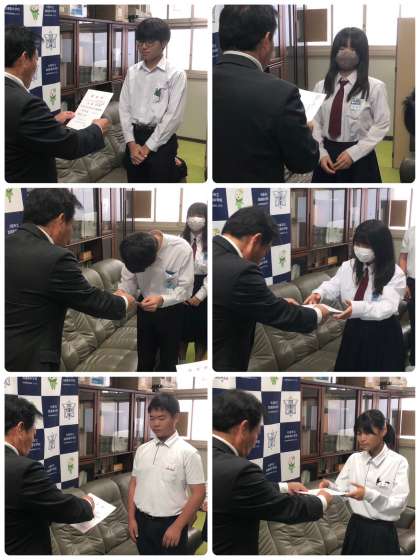 全校生徒とのあいさつの後、生徒会後期専門委員会の認証式を行いました。各委員会を代表して、各学年3組の委員長が認証状を受け取りました。
