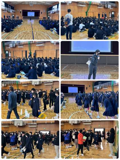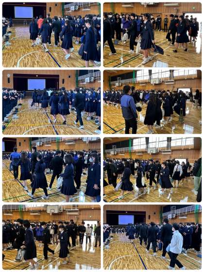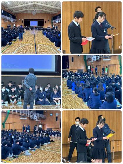 本日3月4日(月)1限目は、生徒代議員会による「3年生を送る会」を体育館にて実施しました。コロナ禍や体育館建て替え工事のため、全校生徒が体育館に集合する行事は、生徒全員が初めての体験になります。