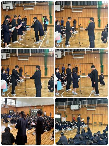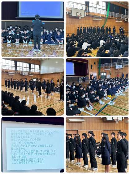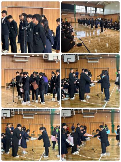 在校生代表あいさつ、生徒代議員会全員でのはなむけの言葉、歌「ひまわりの約束」、メッセージカード贈呈を行いました。メッセージカードは卒業まで、各クラスにて掲示します。