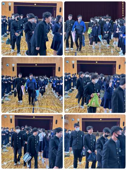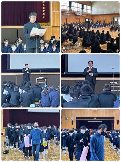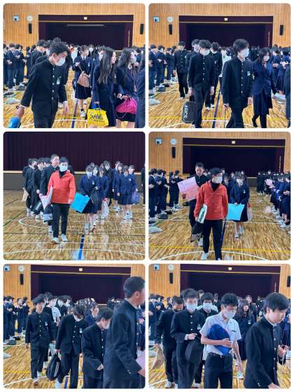 卒業生代表あいさつ、阪井校長先生からのはなむけの言葉にて「3年生を送る会」が終了しました。最後は1・2年生の花道を3年生が退場して行きました。