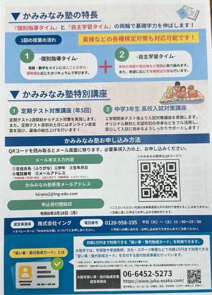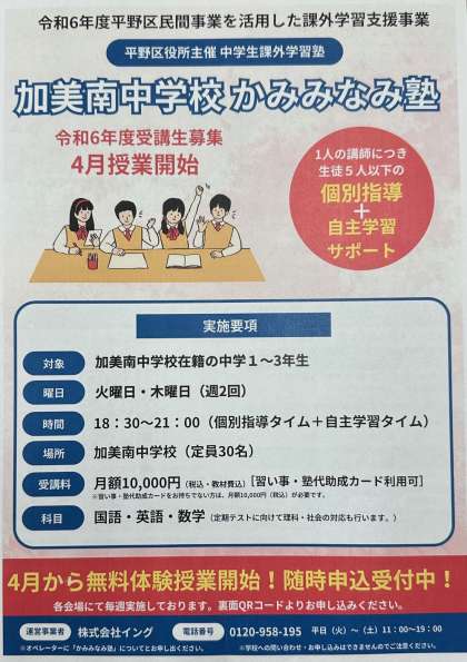 かねてから予告していた、令和6年度平野区民間事業を活用した課外学習支援事業の「かみみなみ塾」の詳細がようやく、最終決定しました。