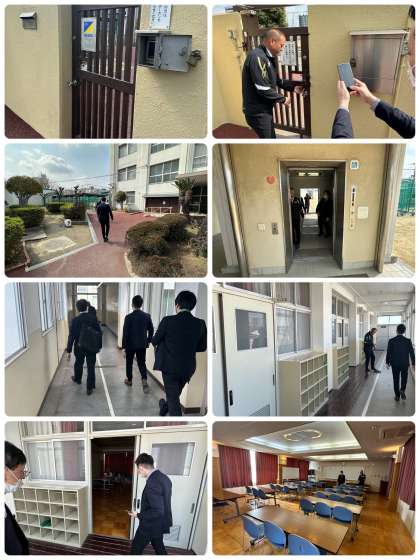 塾に来る時は、本日の打ち合わせで動線確認をした下部写真のように、正門から入校し、エレベーターにて3Fに上がり、多目的室へ移動してください。それ以外の通路はアルソックの防犯システムが作動するので、入らないようにお願いします。