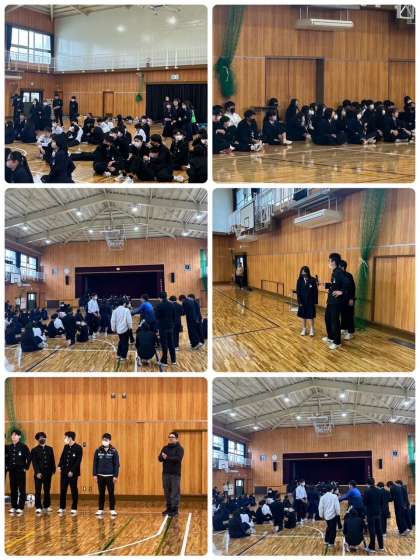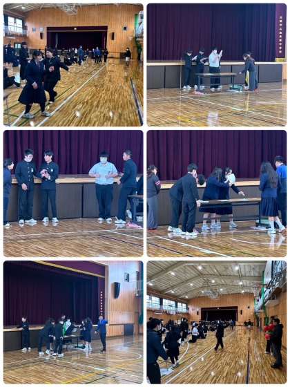 新しい体育館では、最初で最後の学年としての取り組みとなりましたが、実行委員長の坂本くんからの「本質」についての話に始まり、クラス対抗のゲーム大会が進められました。