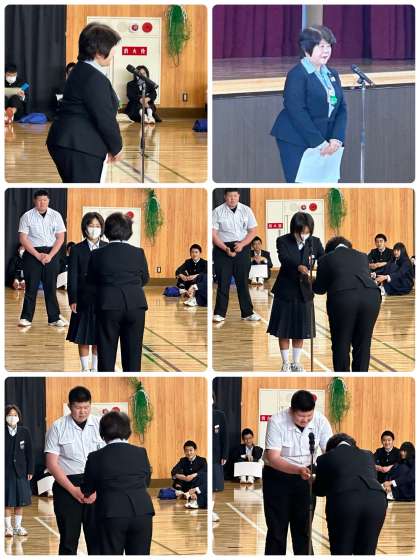 続いて、平野区の「ひらちゃん読書ノート」という、3千ページ以上の読書をした生徒全員を表彰する取り組みで、平野区内11校の中学校の中で、本校生徒がダントツに多かったことにより、平野区の武市区長がわざわざ、直接の表彰をするため、来校してくれました。