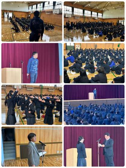 阪井校長先生から令和5年度を振り返り、加美南中学校生としてのプライドを持って、新年度を迎える準備をしてくださいとのお話がありました。浅野生徒指導主事からは、生活指導全般のお話がありました。