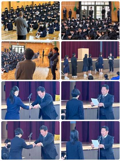 本日3月21日(木)は、5限目に令和5年度修了式を実施しました。阪井校長先生から各学年の代表生徒に修了証が手渡されました。