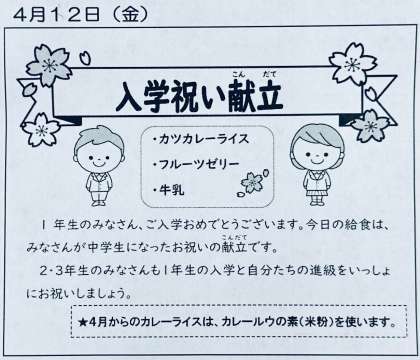 ◆本日4月12日(金)の給食「入学祝い献立」◆