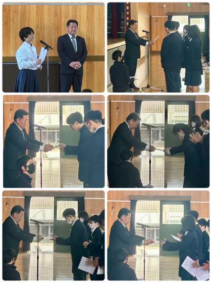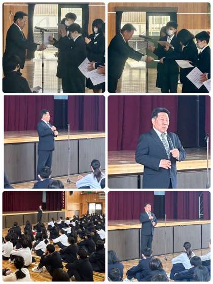 全校集会では、全校生徒とのあいさつの後、令和6年度前期学級委員役員の認証式が行われ、各学年1組の学級委員長が、代表して認証状を受け取りました。