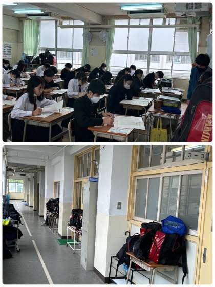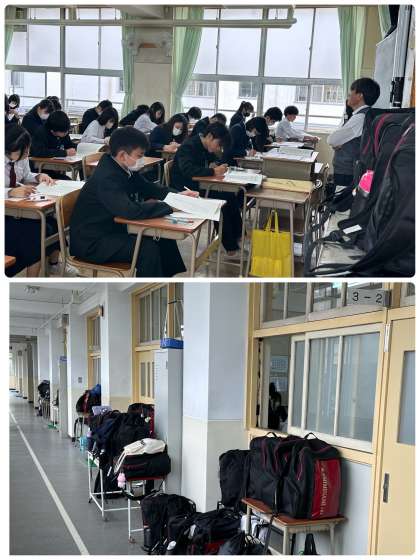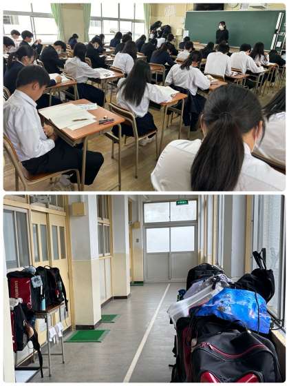 3年生になって初めてのテストなので、頑張ってください。昨日はアンケート調査を行いました。1限目の国語科テストの様子です。