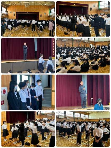 8:00〜8:15にほとんどの生徒が登校し、全校集会のために体育館に集合しています。今日は初めて、運動場での全校集会を予定していましたが、昨夜の雨により、グランド状態が悪いため、体育館での全校集会となりました。