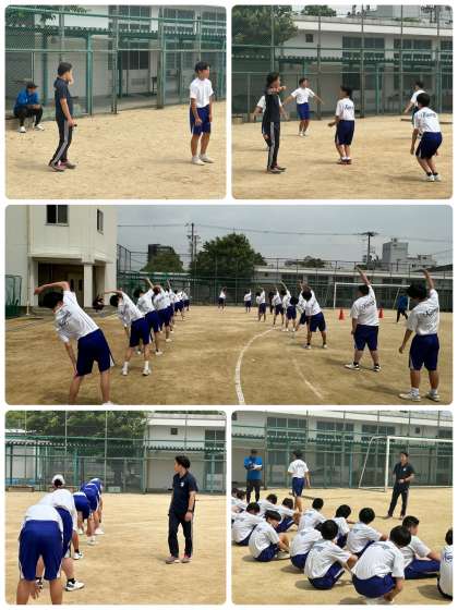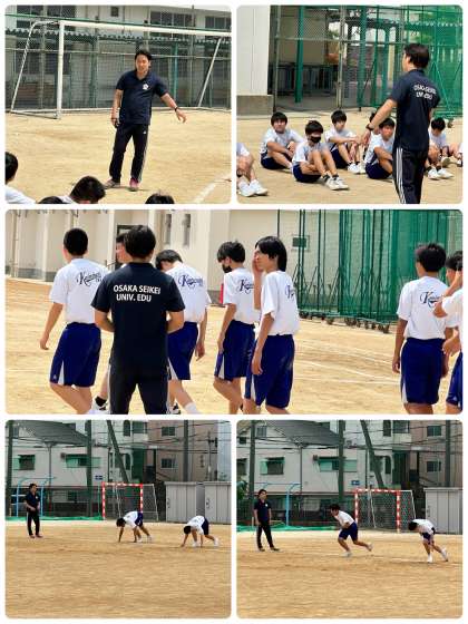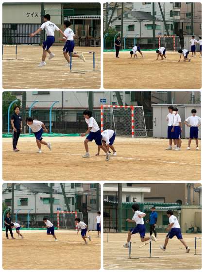 令和6年度前期インターシップとして、授業補助をしている、大阪成蹊大学生の齋藤先生による3年3組男子保健体育科、ハードル走の授業です。