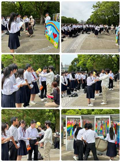 平和セレモニーとして、「平和の誓い」「千羽鶴奉納」「黙とう」を行いました。