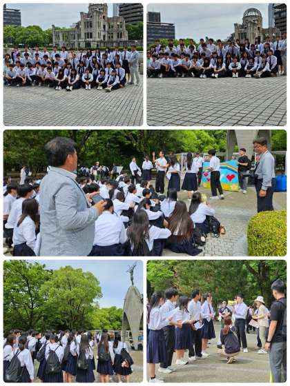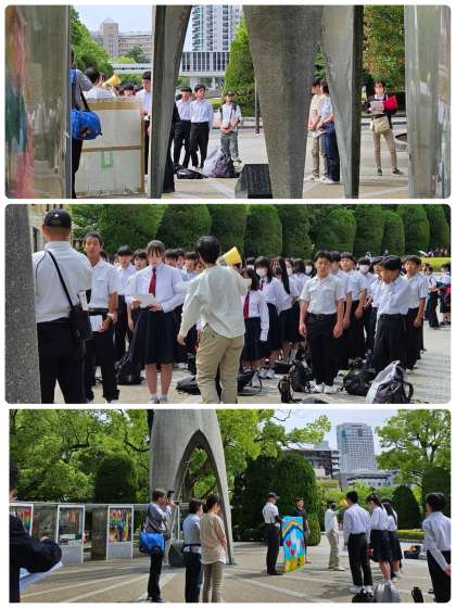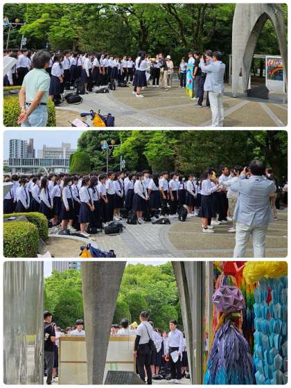 原爆ドームを背景にした学級写真と平和セレモニーの様子です。