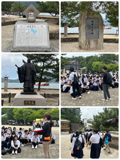フェリーが到着し、平清盛像の前まで移動して、宮島での流れの説明がありました。