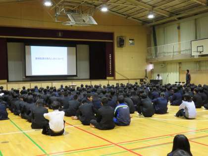 11月14日(土)、土曜授業として、薬物やタバコ、アルコールの危険性を認識させ、薬物乱用の未然防止を徹底するため、「薬物乱用防止教室」を実施しました。学校薬剤師の中山先生を講師にお招きし、わかりやすくお話をしていただきました。