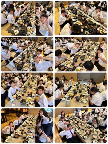 宮浜グランドホテルに戻り、荷物整理・部屋での水筒洗い後、3F大広間にて夕食を食べました。体調不良を訴える者がおらず、全員が元気なまま、夕食を食べています。