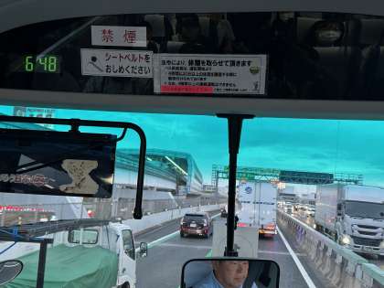吹田から3km渋滞と表示されていますが、車は流れているので、19時15分頃に加美南中学校到着予定です。